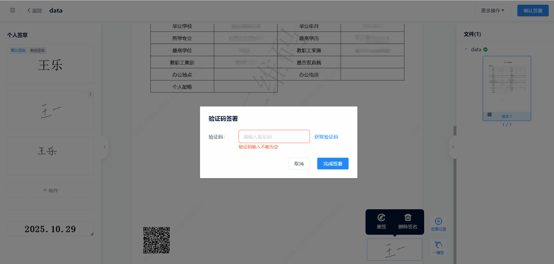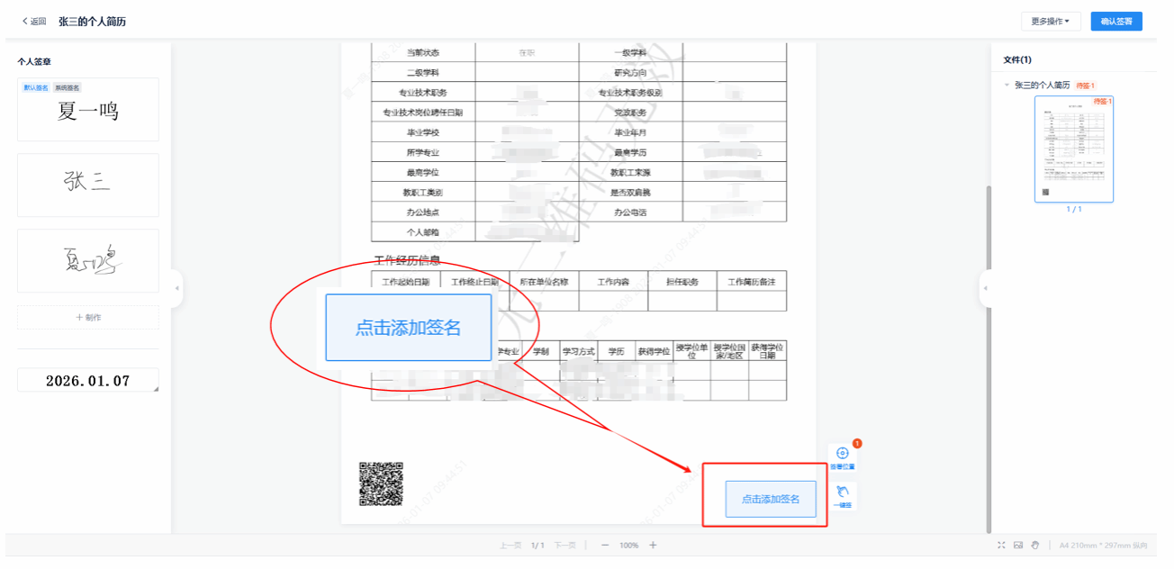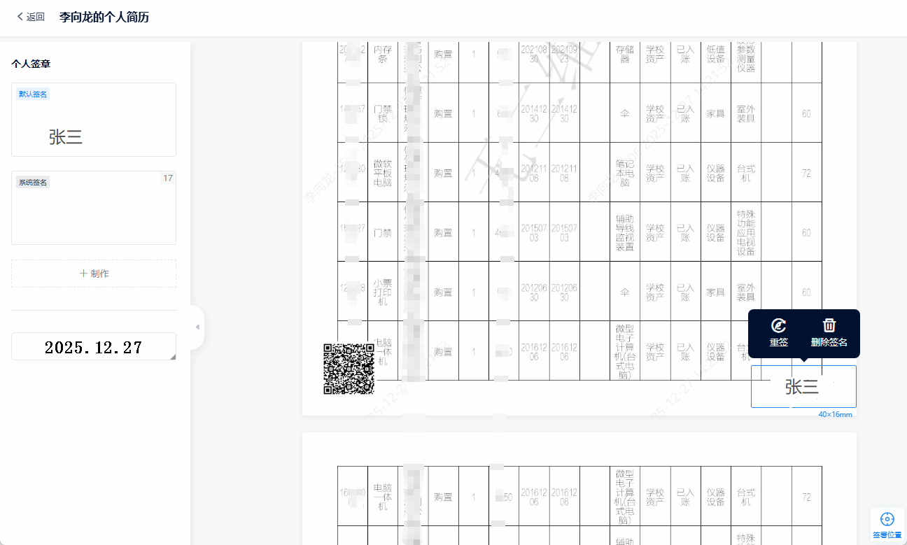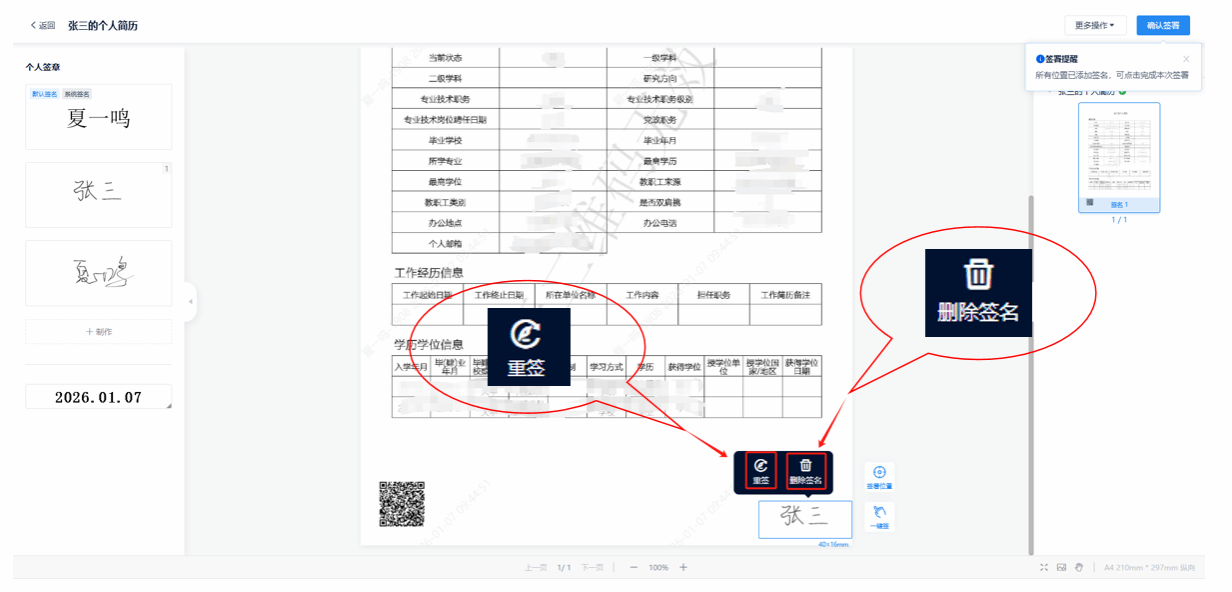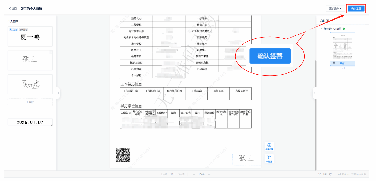 5.选择左侧的个人签章拖动到签章位置即可,点击页面右上角确认签署,一份专属的带有个人印章的电子简历制作完毕。