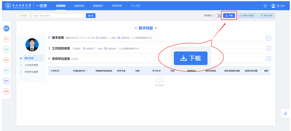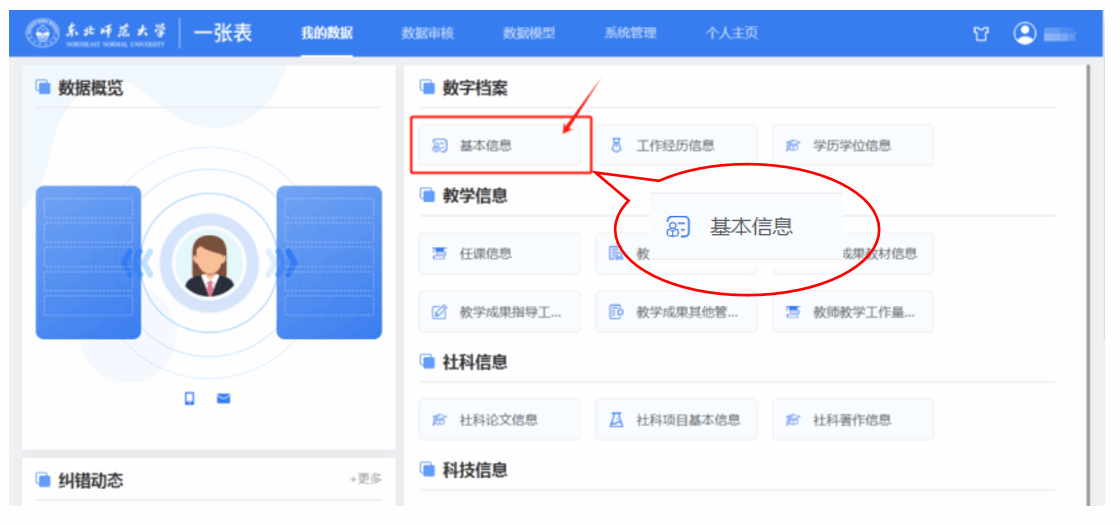 1.登录一张表系统(https://me.nenu.edu.cn),进入信息页,点击任意一项内容均可,这里以点击“基本信息”为例。