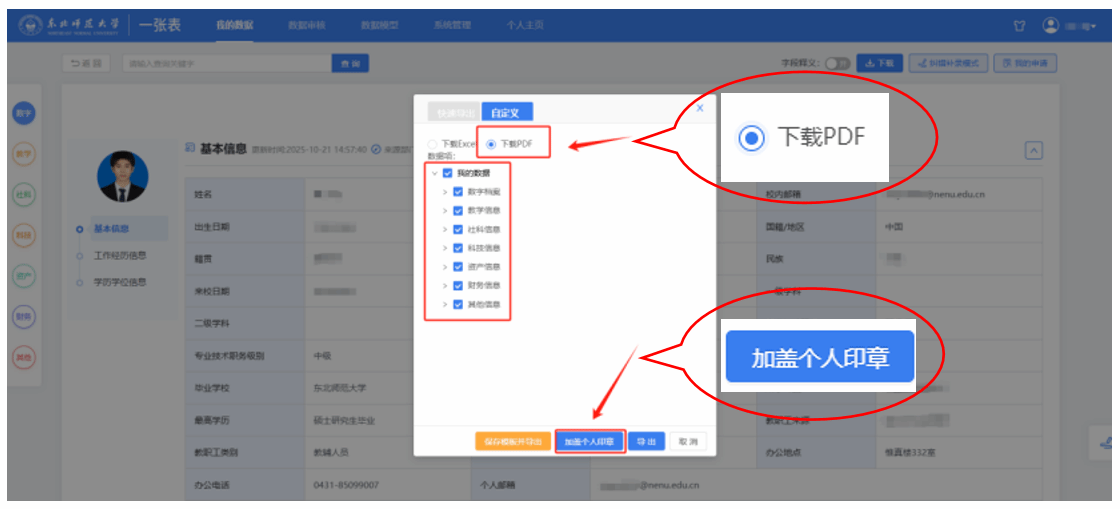 3. 选择PDF格式,勾选希望在电子简历显示的个人基本信息、教学信息、科研信息后,点击下方"加盖个人印章"。