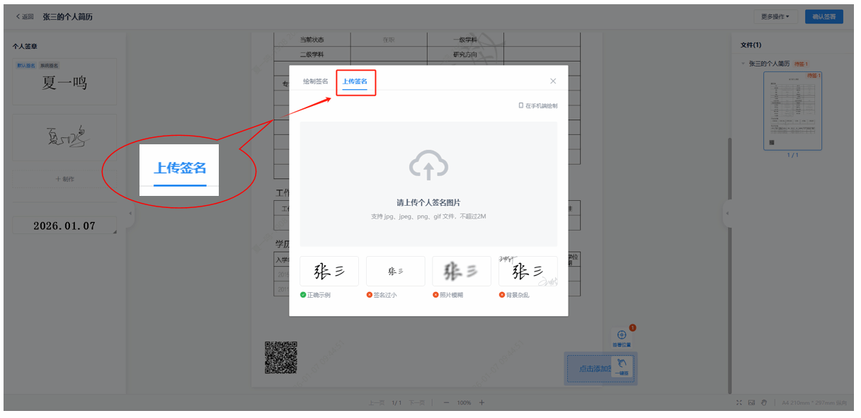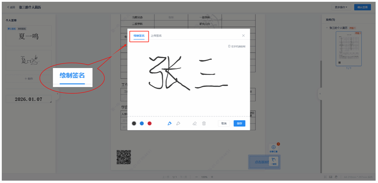 下面是签名制作区,可通过电脑端绘制、手机端绘制或上传签名图片等方式完成签名制作。