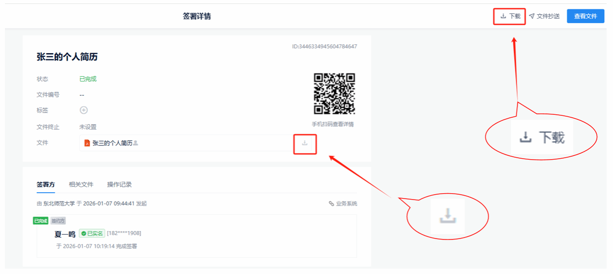 签署完成文档,可通过下载按钮,获取PDF文件。