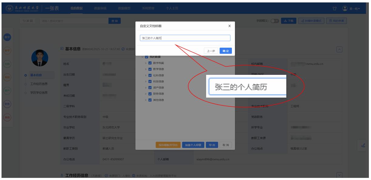 经过近半年的开发测试,现面向全校师生推出个人电子简历服务,这是继教师个人主页平台之后的又一项基于公共数据的创新应用,使用个人电子简历服务可一键生成带有个人电子印章的简历。简历内容按需呈现,个人信息、科研、教学等数据均来源于对应的业务系统,集权威性和准确性于一体,同时提供简历真实性在线验证功能。